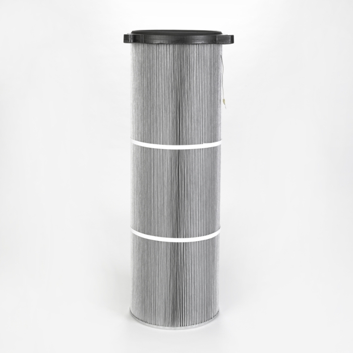 Cartridge Filter with open top end cap with 3 hooks, 180 mm pitch diameter and closed bottom end cap in Ultra-Web Spunbond Anti-Static, 145 mm outer diameter x 300 mm long including top gasket; Special features: Dirty Air Plenum and Clean Air Plenum installation, earthed for Quick Fix and other brands of cartridge collectors